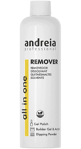 Modo de usar: Com um buffer ou lima desbastar a camada de gel da superfície da unha, tendo cuidado para não atingir a unha natural. Embeba um algodão com o Removedor de Verniz Gel Andreia, aplique na unha e envolva com prata. Curar de 5 a 15 minutos sob luz UV ou de 5 a 8 minutos sob luz LED. Remova o gel excedente da unha com o auxílio de uma lima ou pau de flor de laranjeira, sem atingir a unha natural.